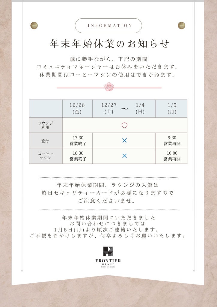 日頃よりフロンティアグラン西新宿をã”利用ã„ãŸã ãã€èª ã«ã‚りãŒã¨ã†ã”ã–ã„ã¾ã™ã€‚